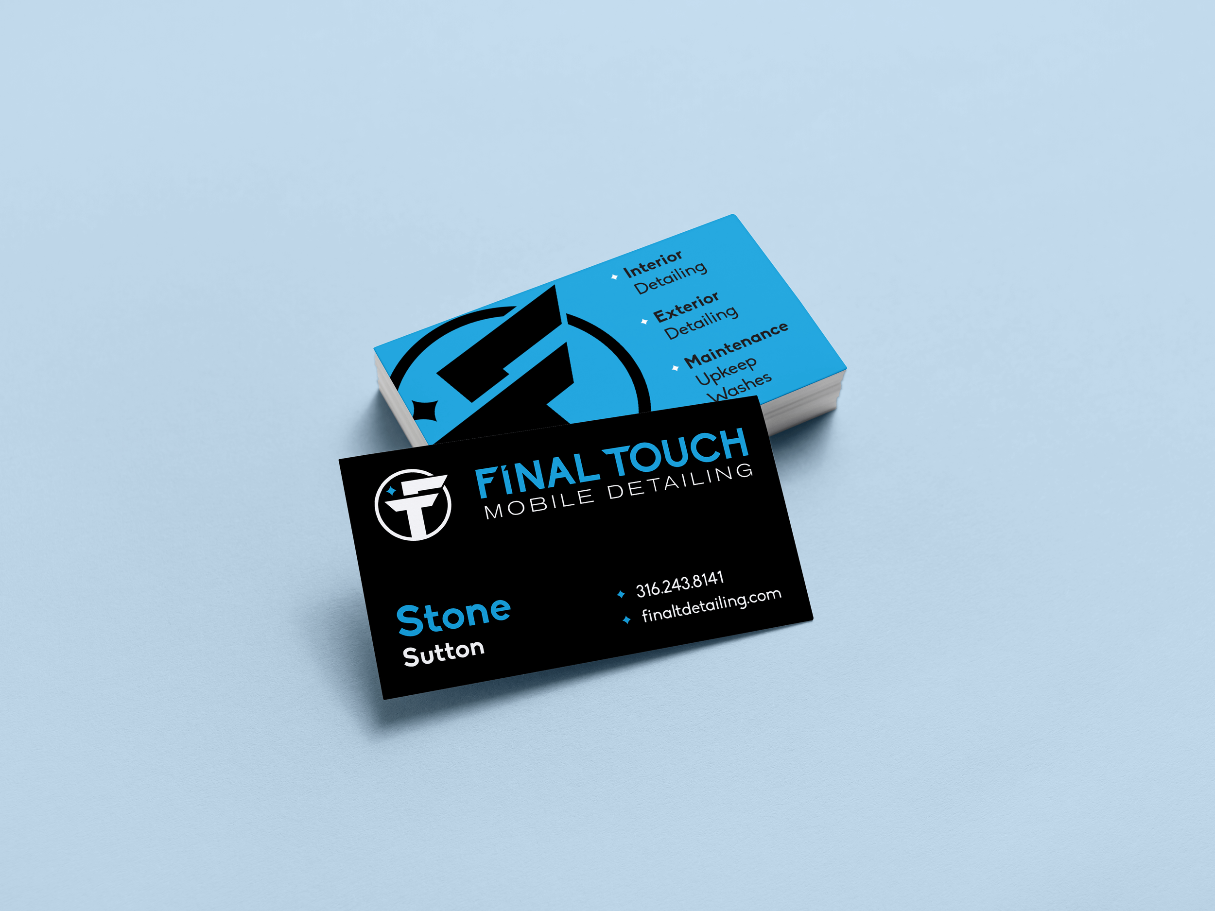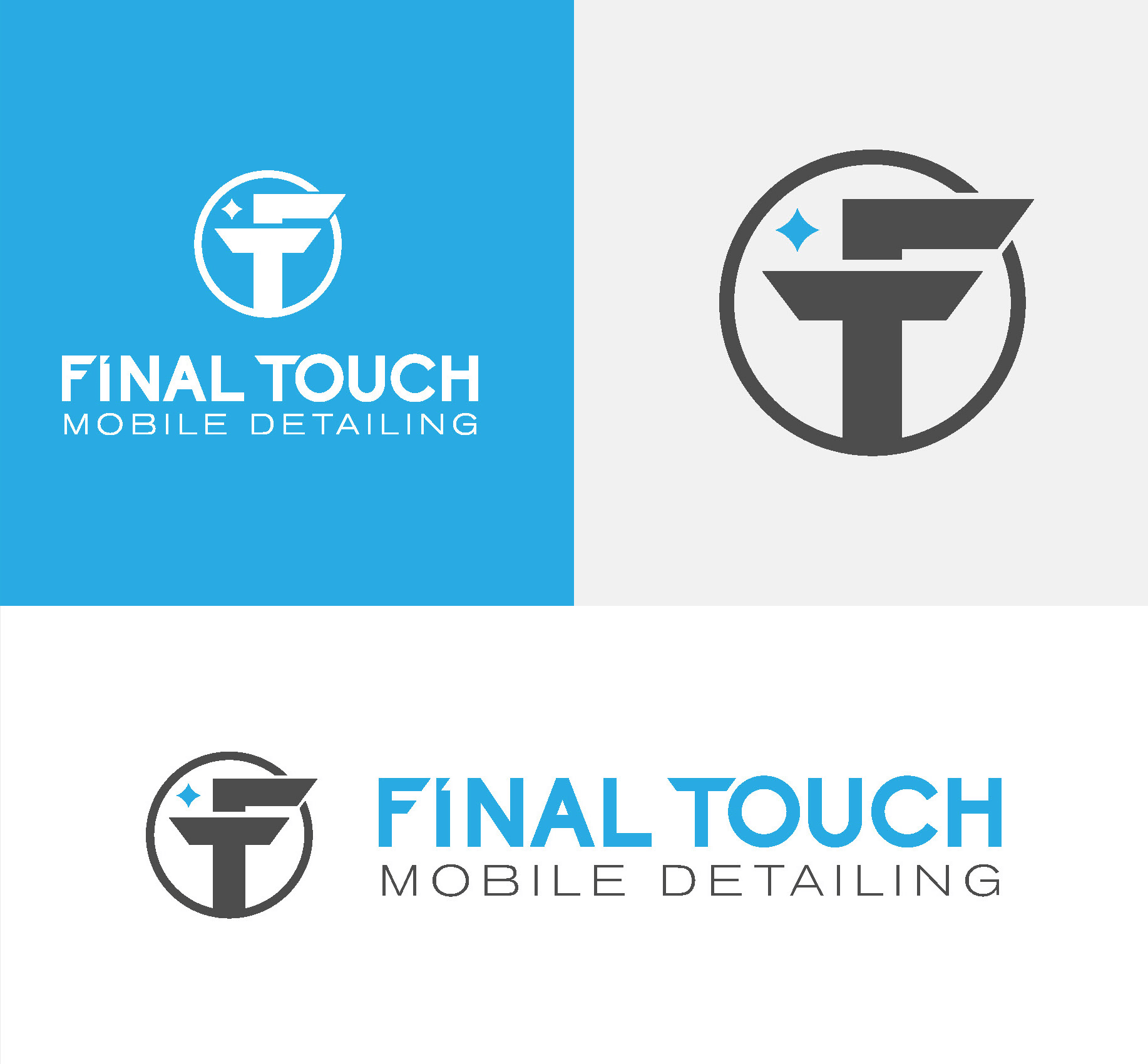 Introducing the logo for Final Touch Mobile Detailing—a sleek and modern design that brilliantly combines the initials F and T into a truly unique and memorable mark. The thoughtful incorporation of a sparkling element symbolizes excellence in detailing, along with an unwavering emphasis on cleanliness. The bold contrast of charcoal gray and bright blue not only enhances the logo's overall visual appeal but also effectively conveys a sense of professionalism and reliability. This logo epitomizes the brand's steadfast commitment to delivering exceptional mobile detailing services, making it a standout choice for discerning vehicle care.